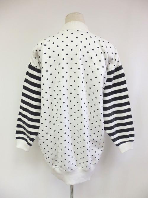 COLOR ■WHITE×BLACK RANK B(腹部に2cm程度の薄汚れ、1mm程度の点汚れ3か所ほどフロントにありますためお値下げしております。古着特有の使用感、毛玉あります) SIZE 総丈84/肩幅60/袖丈46/バスト132