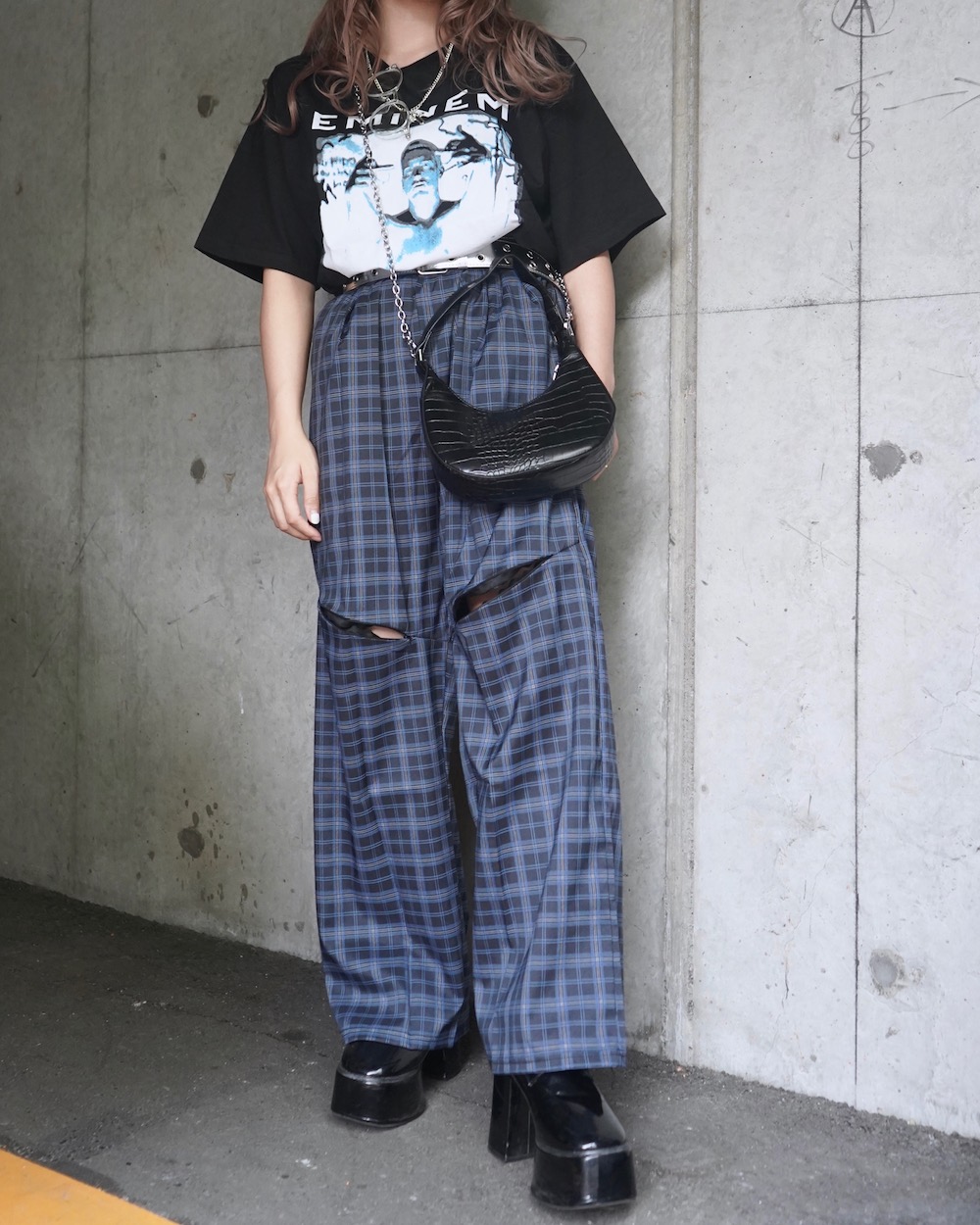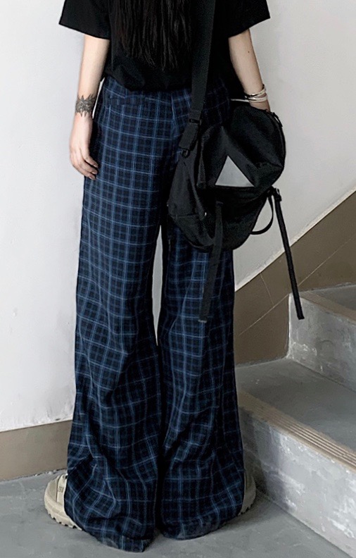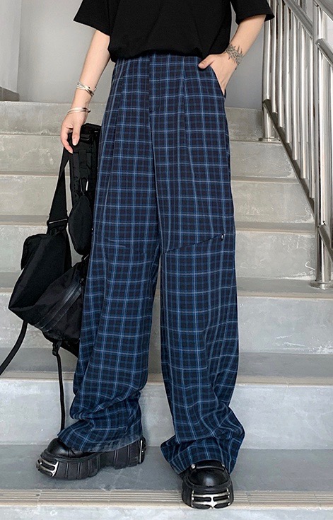 2way Knee-Slit Check Wide Pants (blue-black)