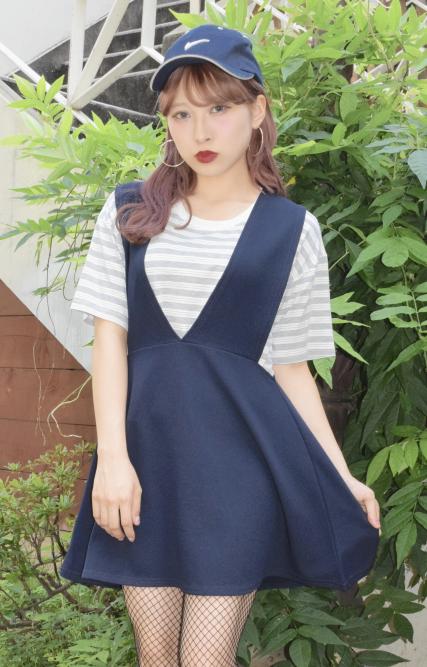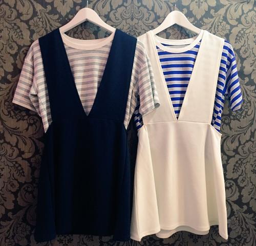 SIZE: (Tシャツ) 総丈48cm 肩幅52cm 袖丈16cm バスト100cm (ジャンパースカート) 総丈78cm 肩幅37cm ウエスト78cm スカート部分全長42cm COLOR: ・BLUE T-SHIRTS & WHITE SKIRT ・GREY T-SHIRTS & NAVY SKIRT RANK:SS(新品アイテム)