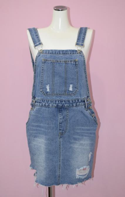 - 肩のアジャスターで丈調整可能 /胸に1ポケット/フロント2ポケット/バック2ポケット /ベルトループ有/両サイドにリベットボタン3個ずつ有 /裾カットオフデザイン /胸と裾付近にクラッシュデザイン